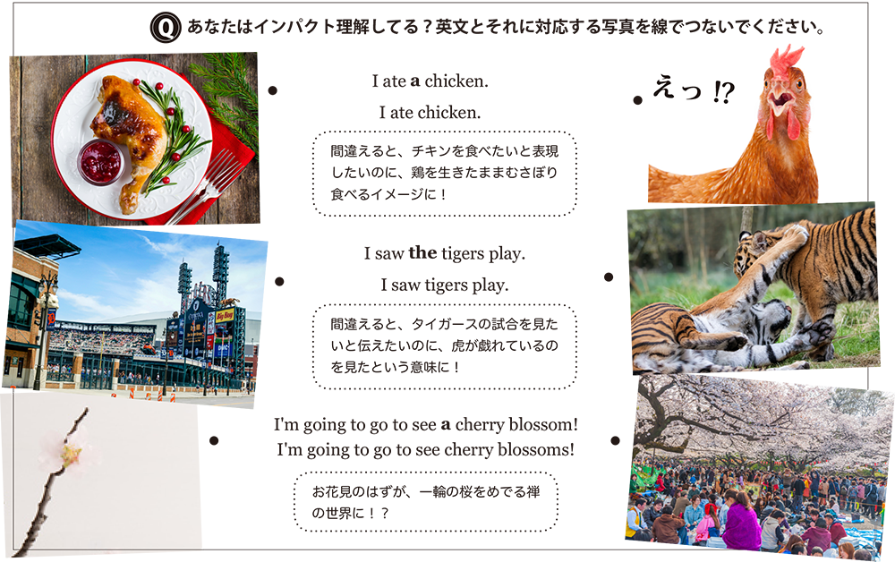 絵を用いて冠詞が必要な状況を再現し、冠詞が必要になる状況を理解します。もちろんネイティブの学習プロセスと全く同じというわけではありませんが、かなり近い方法で冠詞を身につけることができます。